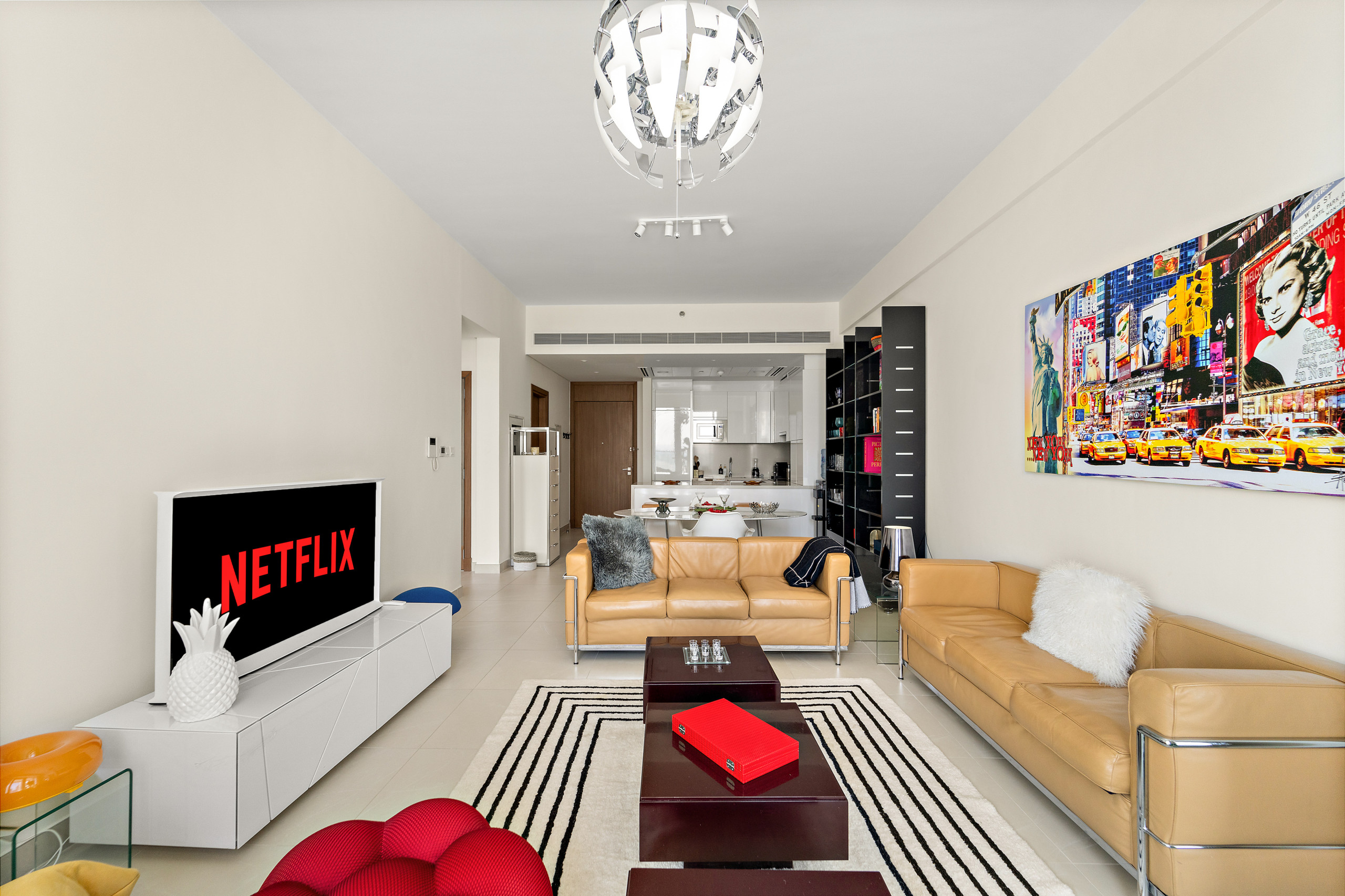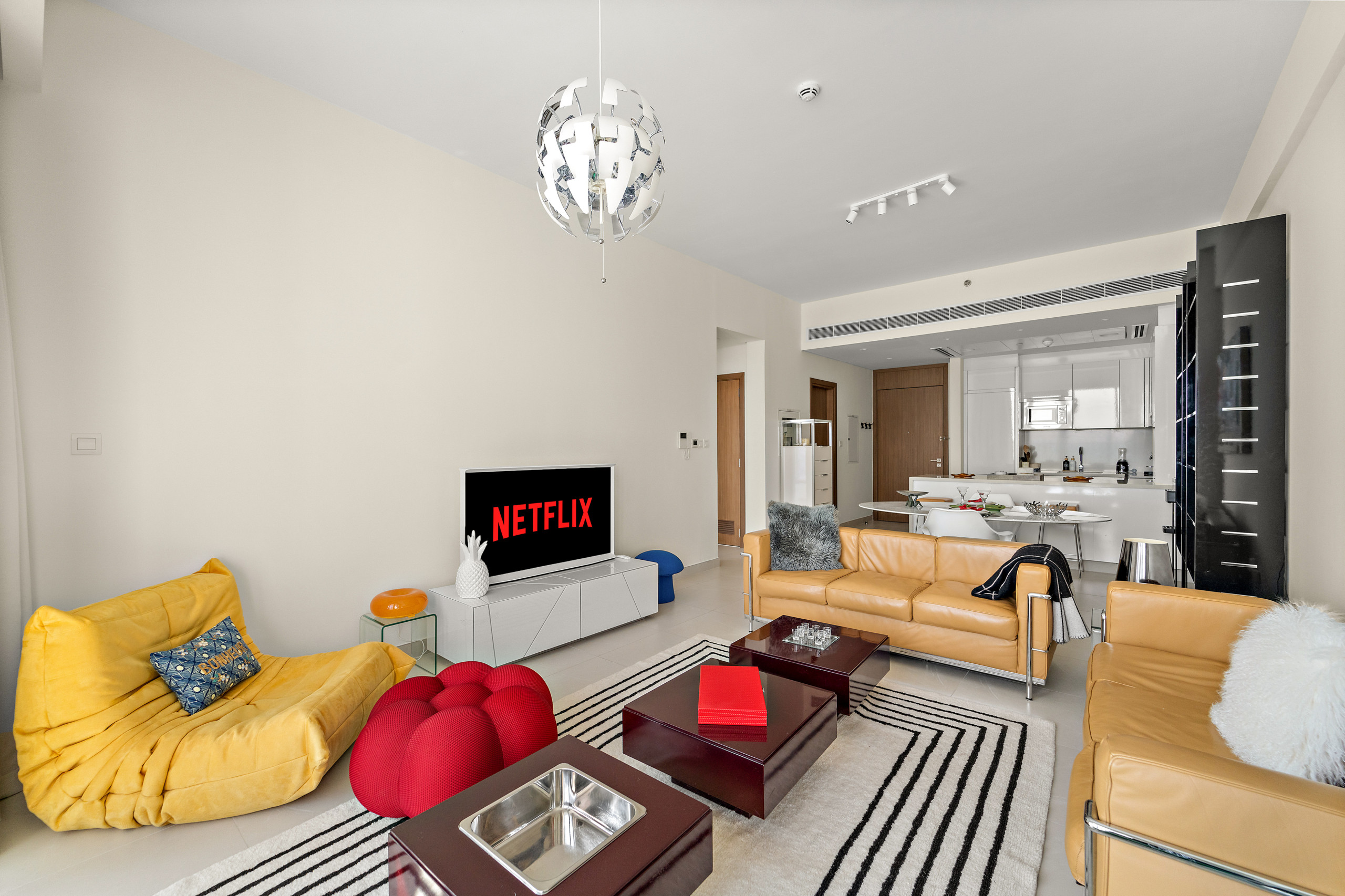 The apartment in Dubai has 1 bedrooms and has capacity for 3 people (max. 2 adults). The apartment is 972 ft². The accommodation is equipped with the following items: elevator, outdoor furniture, washing machine, iron, internet (Wi-Fi), hair dryer, balcony, gym / fitness centre, alarm, air-conditioned, communal+children's swimming pool, garage in the same building, 1 TV. In the electric open plan kitchen, refrigerator, oven, freezer, dishes/cutlery, kitchen utensils and kettle are provided.