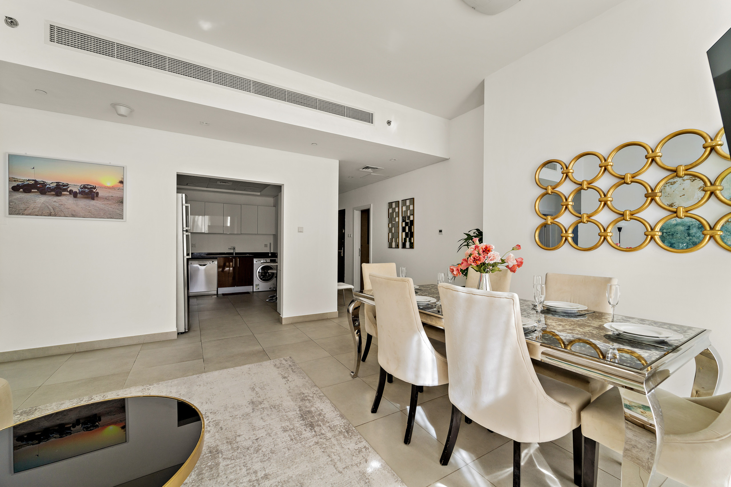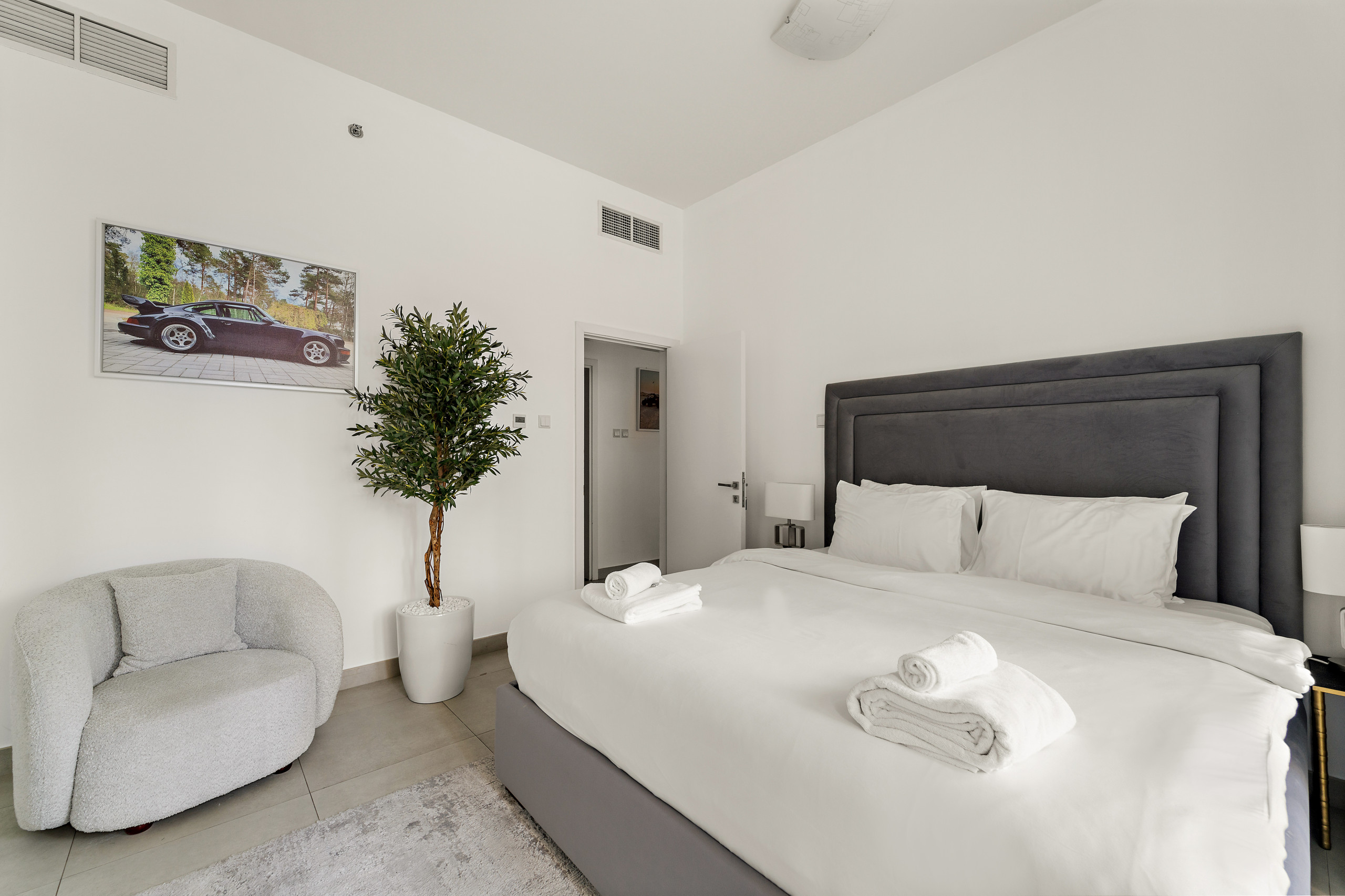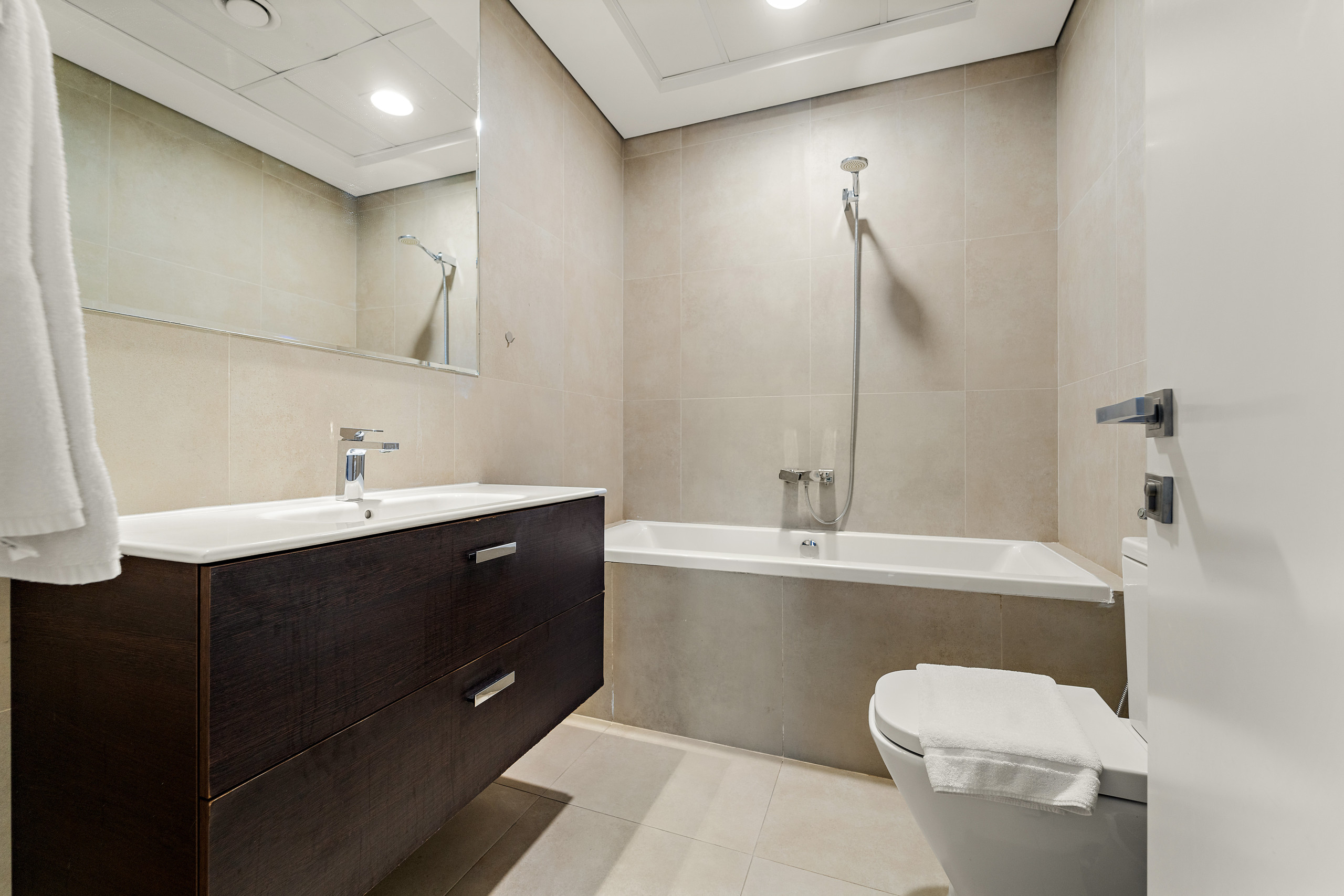 The apartment in Dubai has 2 bedrooms and has capacity for 5 people (max. 4 adults). The apartment is 1,161 ft². The accommodation is equipped with the following items: elevator, outdoor furniture, washing machine, iron, internet (Wi-Fi), balcony, children area, gym / fitness centre, air-conditioned, communal+children's swimming pool, garage in the same building, 2 TVs. In the gas open plan kitchen, refrigerator, microwave, oven, freezer, dishwasher, dishes/cutlery, kitchen utensils, coffee machine, toaster and kettle are provided.