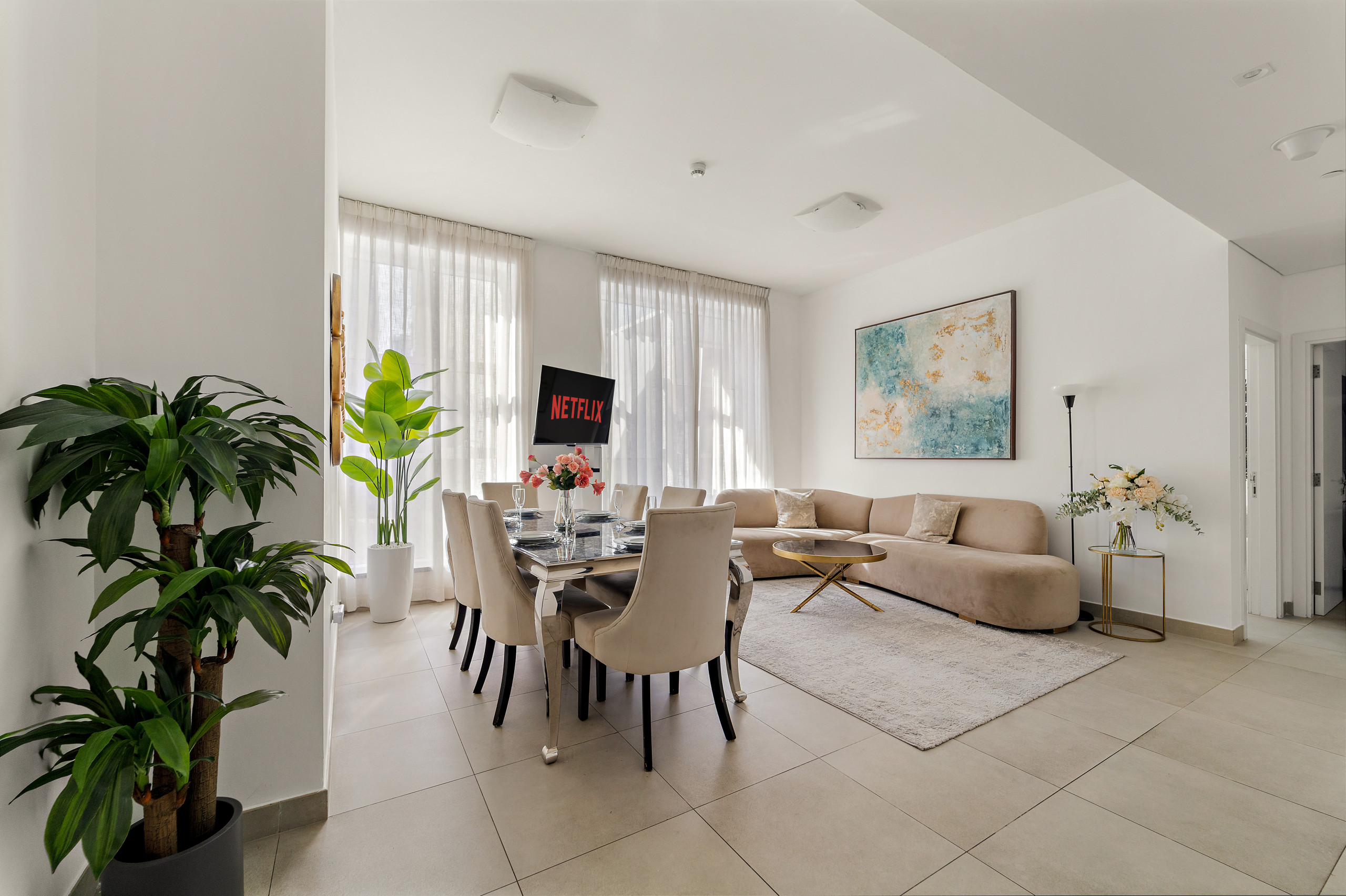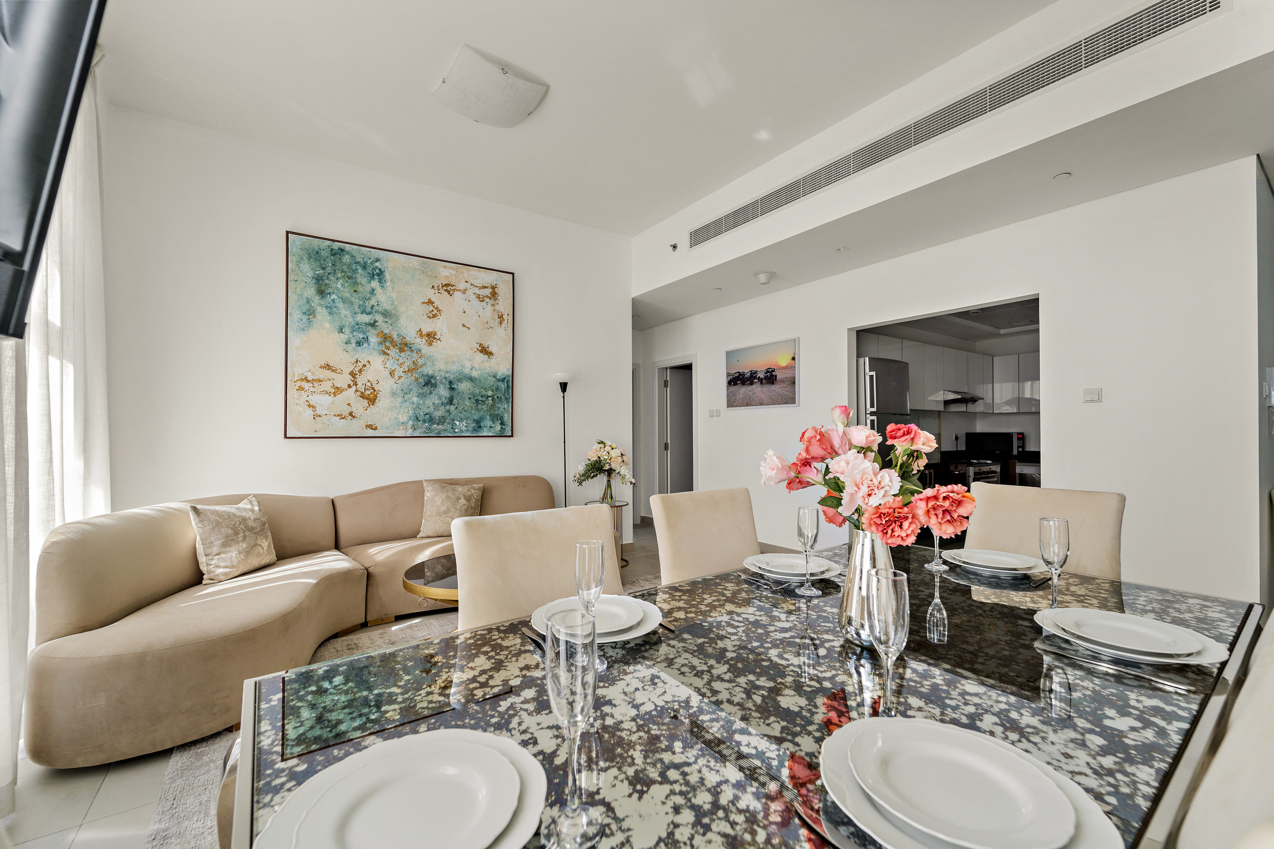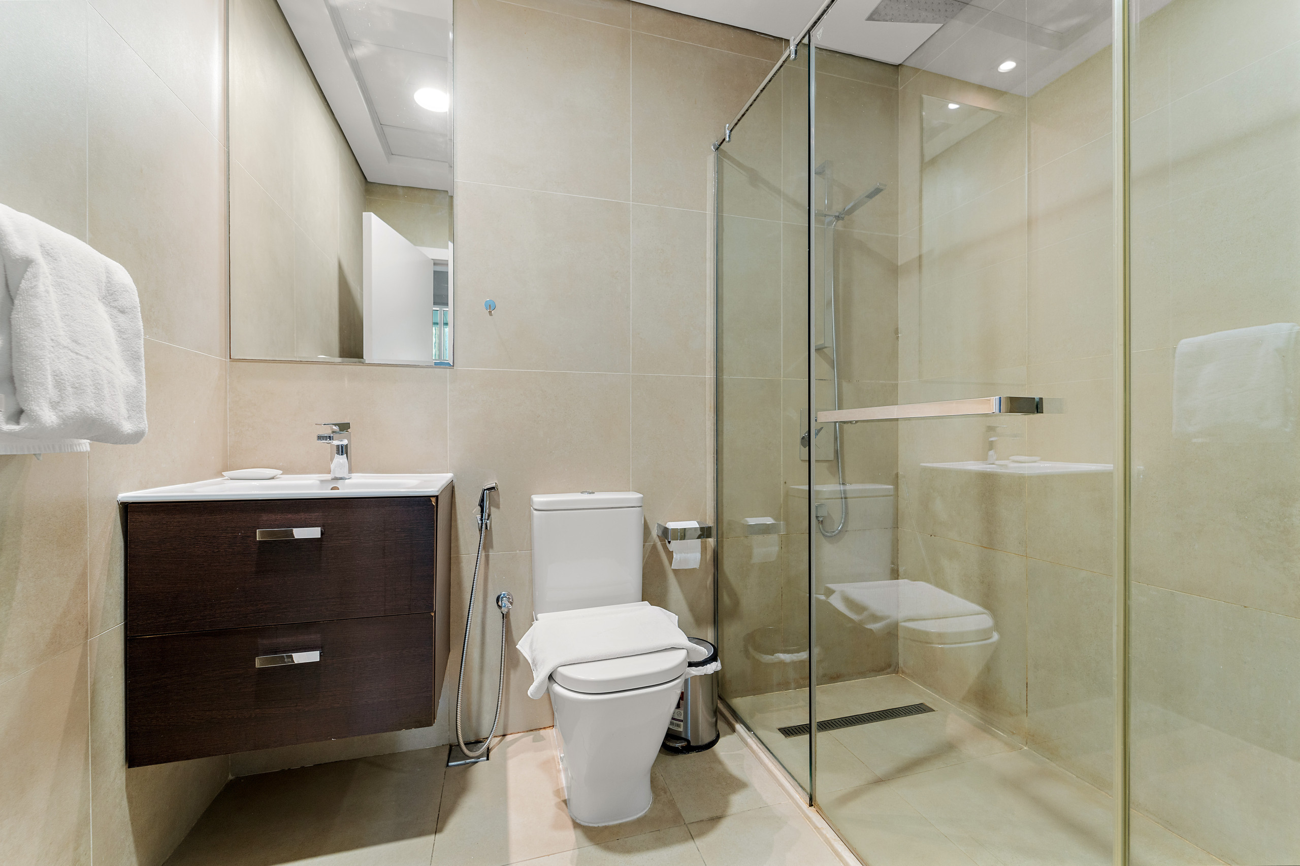 The apartment in Dubai has 2 bedrooms and has capacity for 5 people (max. 4 adults). The apartment is 1,161 ft². The accommodation is equipped with the following items: elevator, outdoor furniture, washing machine, iron, internet (Wi-Fi), balcony, children area, gym / fitness centre, air-conditioned, communal+children's swimming pool, garage in the same building, 2 TVs. In the gas open plan kitchen, refrigerator, microwave, oven, freezer, dishwasher, dishes/cutlery, kitchen utensils, coffee machine, toaster and kettle are provided.