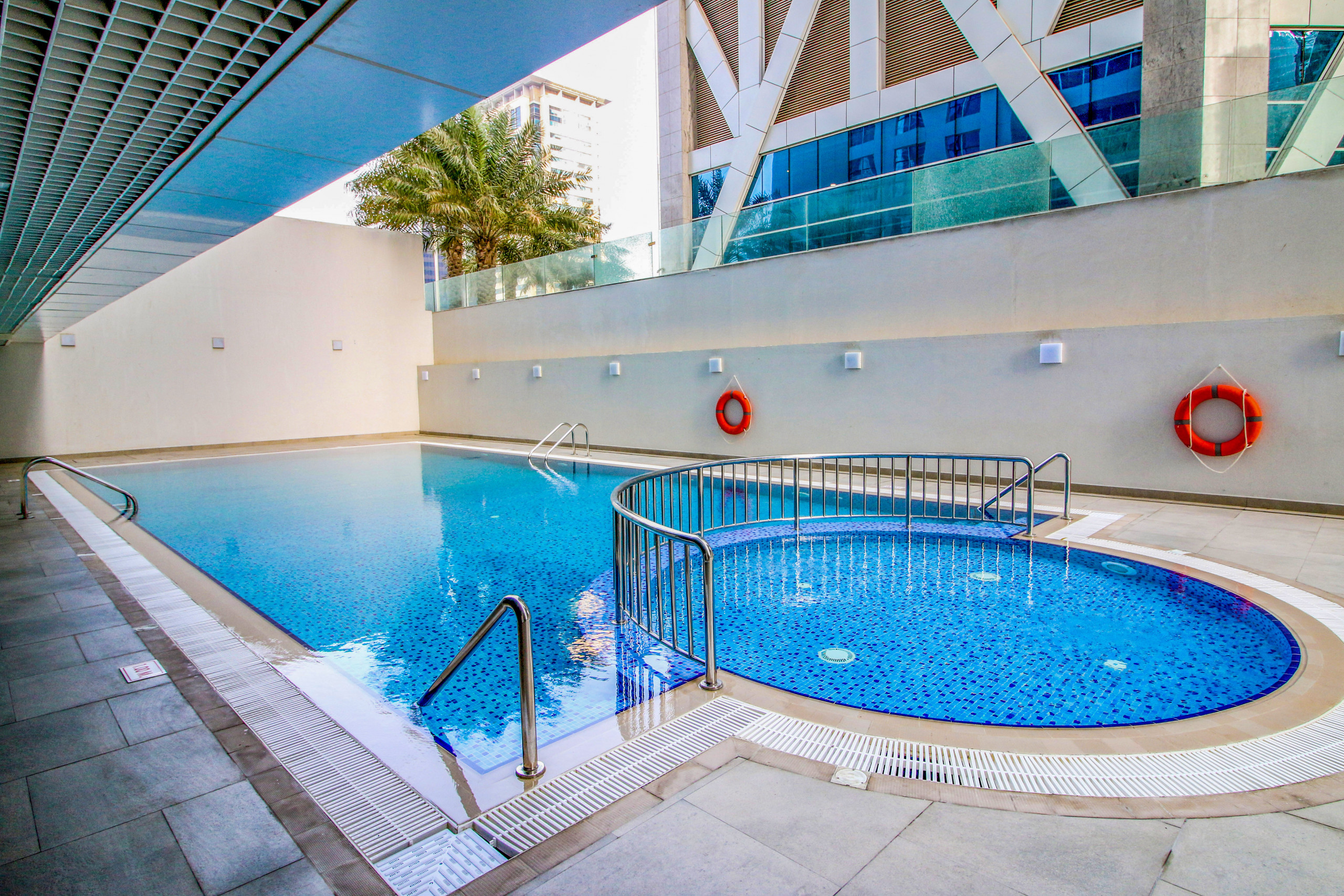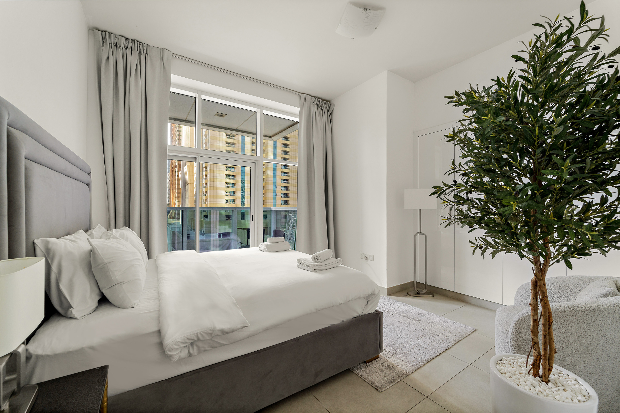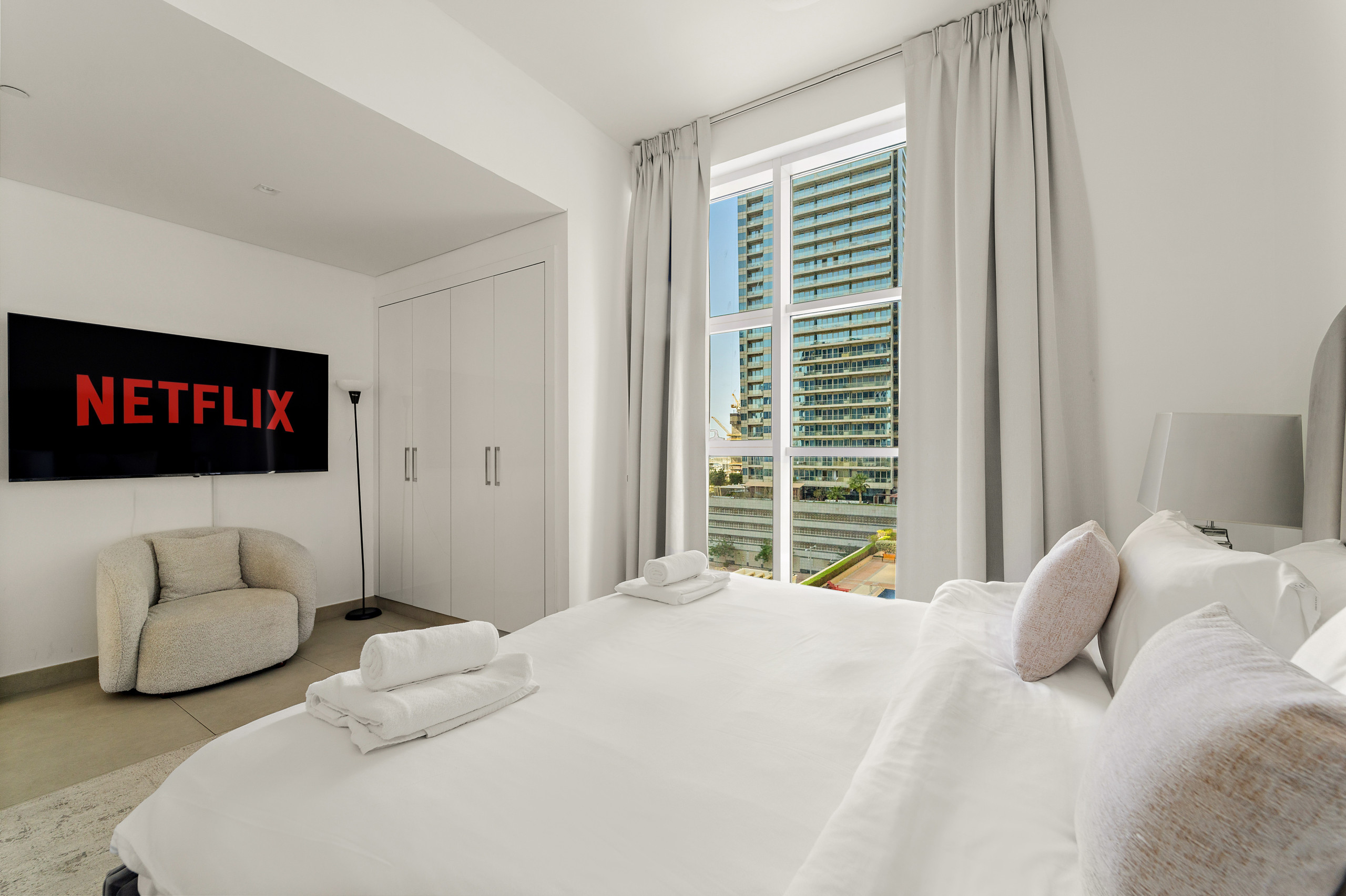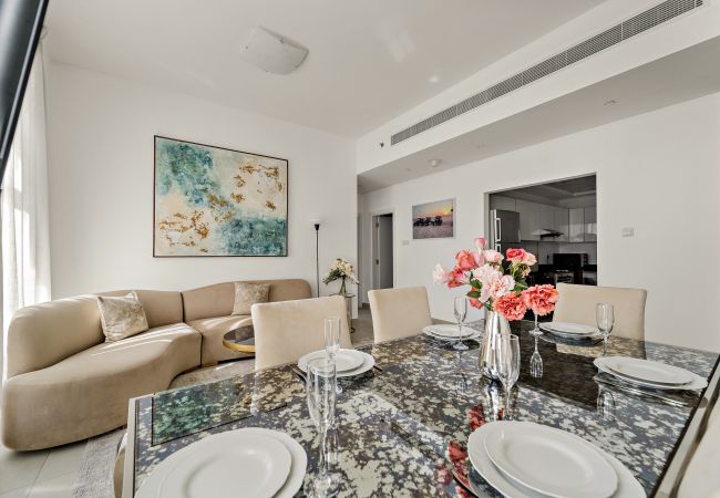 The apartment in Dubai has 2 bedrooms and has capacity for 5 people (max. 4 adults). The apartment is 1,161 ft². The accommodation is equipped with the following items: elevator, outdoor furniture, washing machine, iron, internet (Wi-Fi), balcony, children area, gym / fitness centre, air-conditioned, communal+children's swimming pool, garage in the same building, 2 TVs.In the gas open plan kitchen, refrigerator, microwave, oven, freezer, dishwasher, dishes/cutlery, kitchen utensils, coffee machine, toaster and kettle are provided.