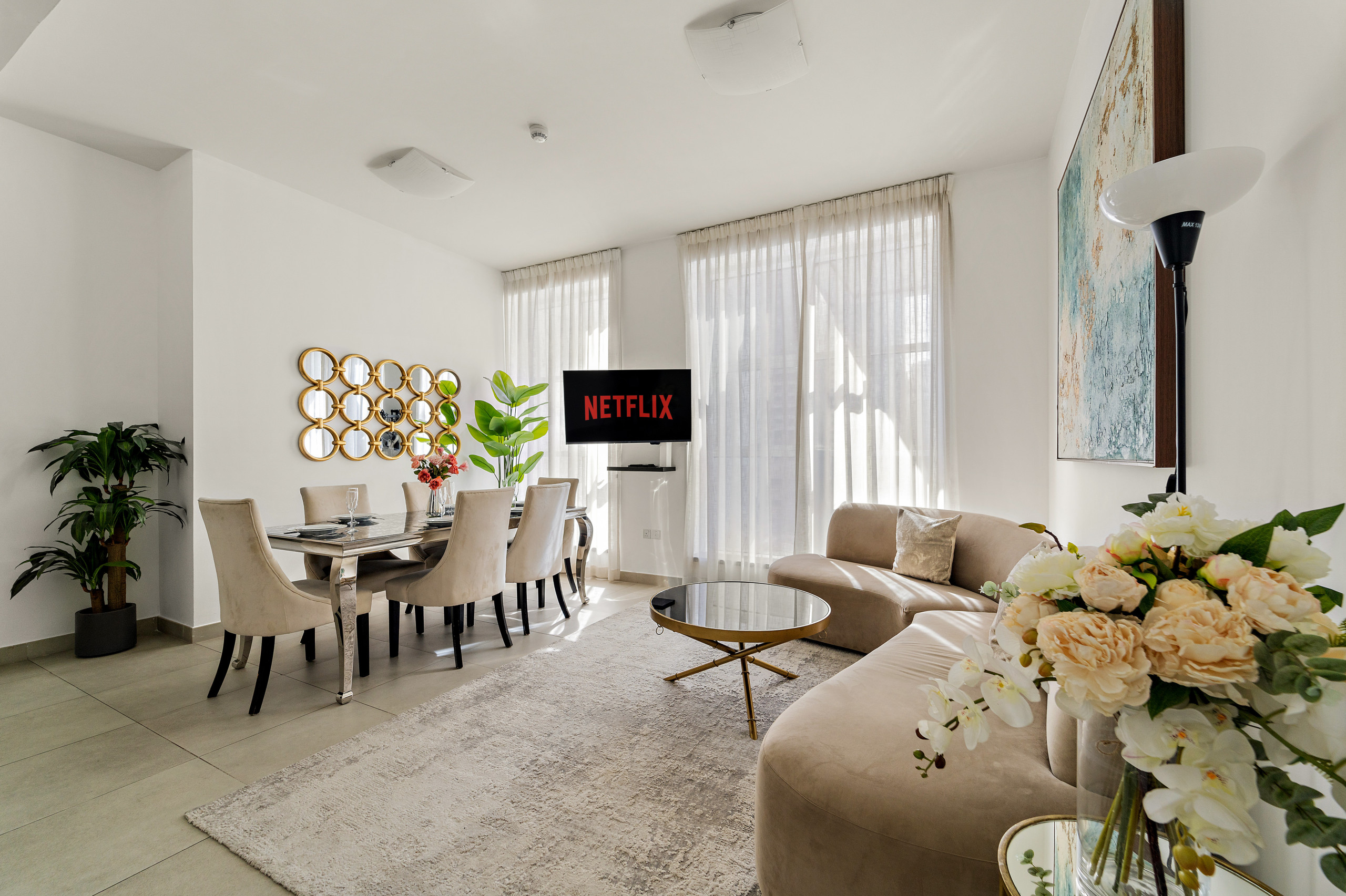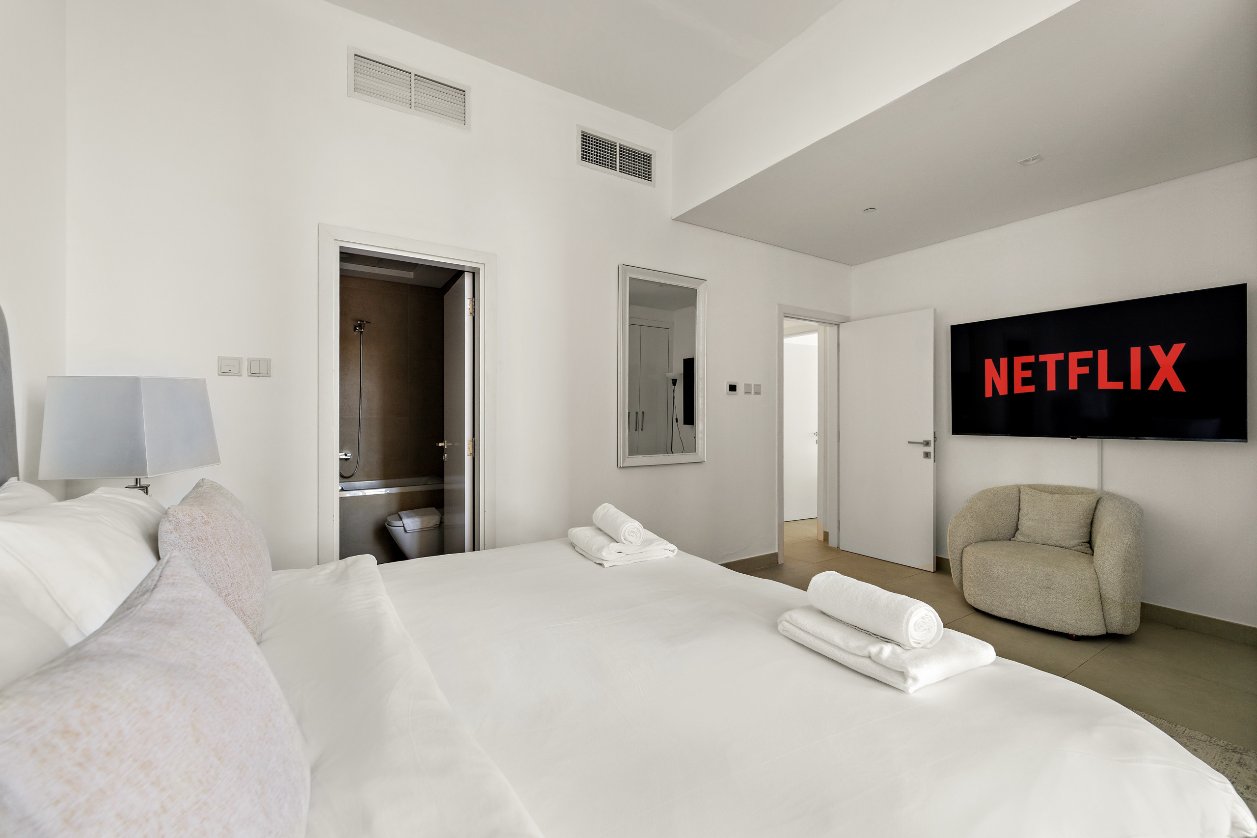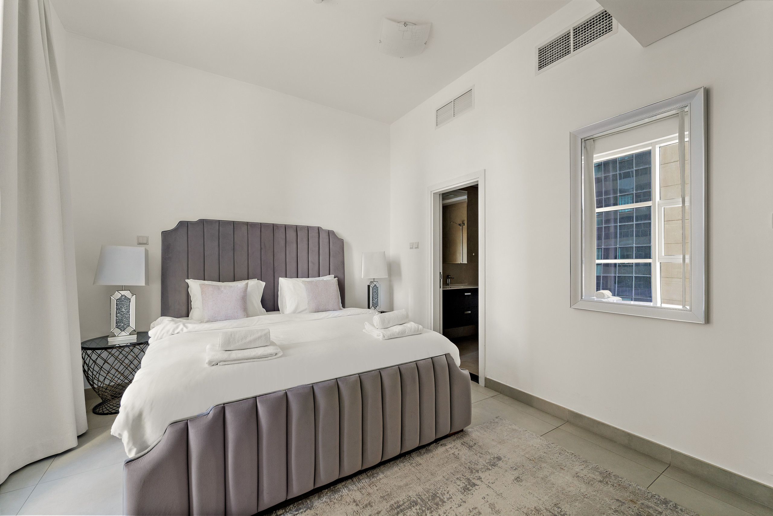 The apartment in Dubai has 2 bedrooms and has capacity for 5 people (max. 4 adults). The apartment is 1,161 ft². The accommodation is equipped with the following items: elevator, outdoor furniture, washing machine, iron, internet (Wi-Fi), balcony, children area, gym / fitness centre, air-conditioned, communal+children's swimming pool, garage in the same building, 2 TVs.In the gas open plan kitchen, refrigerator, microwave, oven, freezer, dishwasher, dishes/cutlery, kitchen utensils, coffee machine, toaster and kettle are provided.