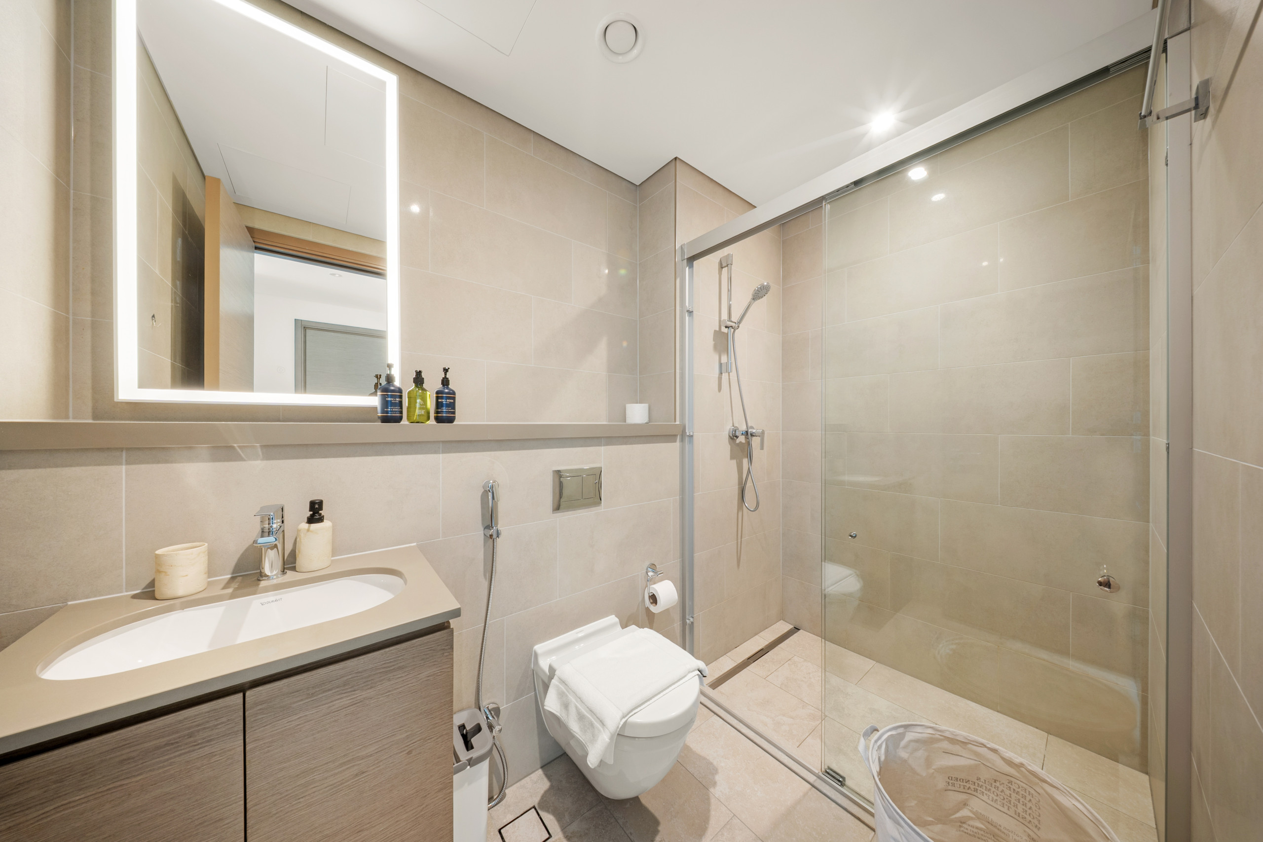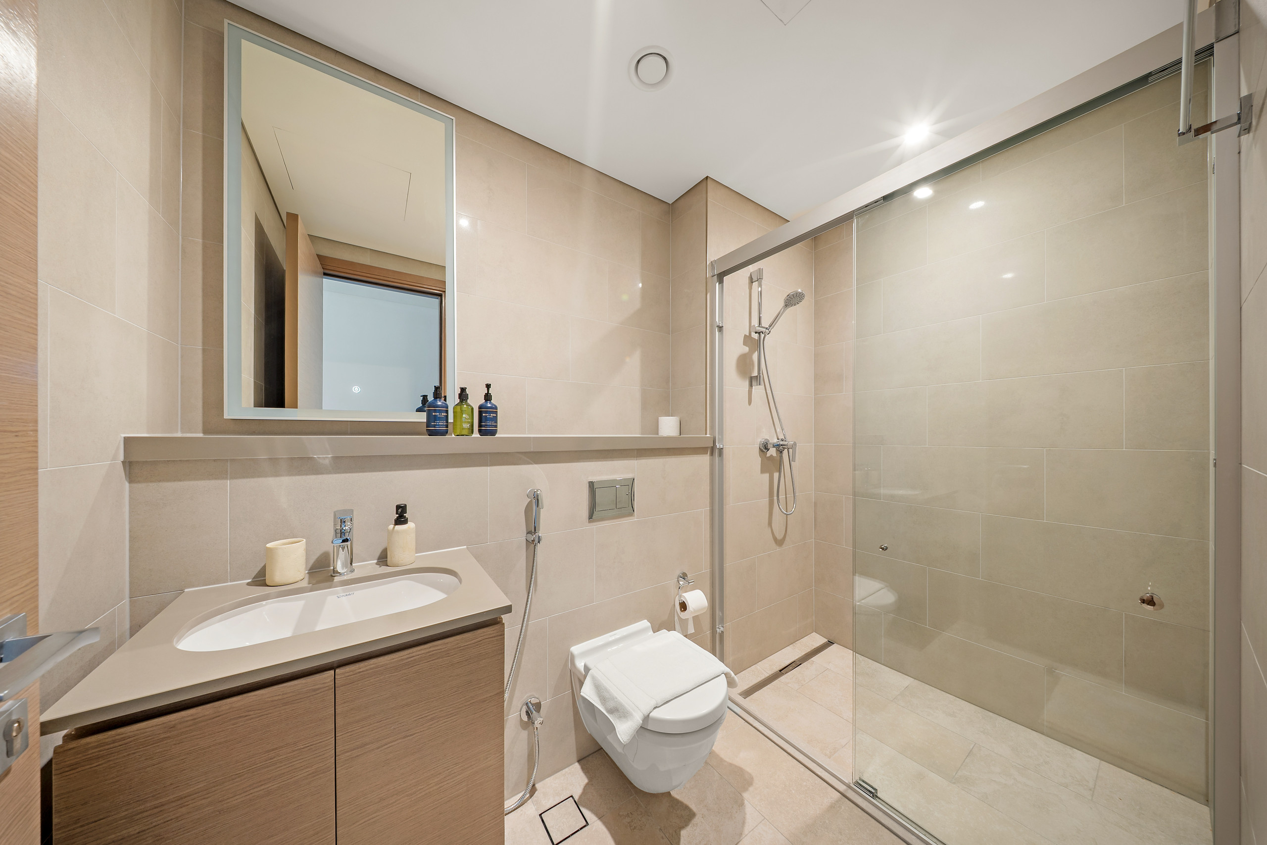 The apartment in Dubai has 2 bedrooms and has capacity for 5 people (max. 4 adults). The apartment is 1,249 ft². The accommodation is equipped with the following items: elevator, outdoor furniture, terrace, washing machine, iron, internet (Wi-Fi), hair dryer, balcony, children area, gym / fitness centre, alarm, air-conditioned, communal+children's swimming pool, garage in the same building, 1 TV. In the gas open plan kitchen, refrigerator, microwave, oven, freezer, dishes/cutlery, kitchen utensils, toaster and kettle are provided.