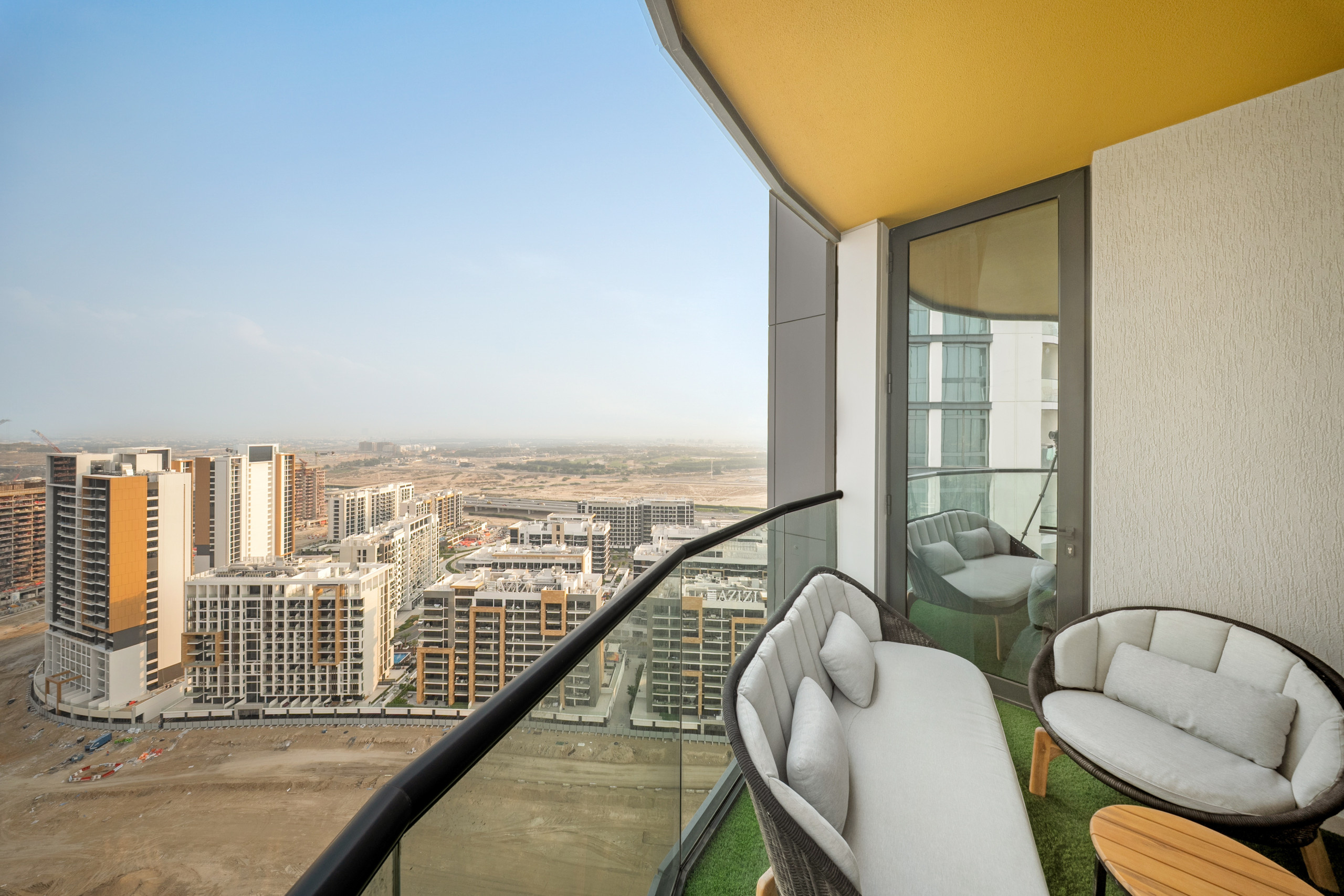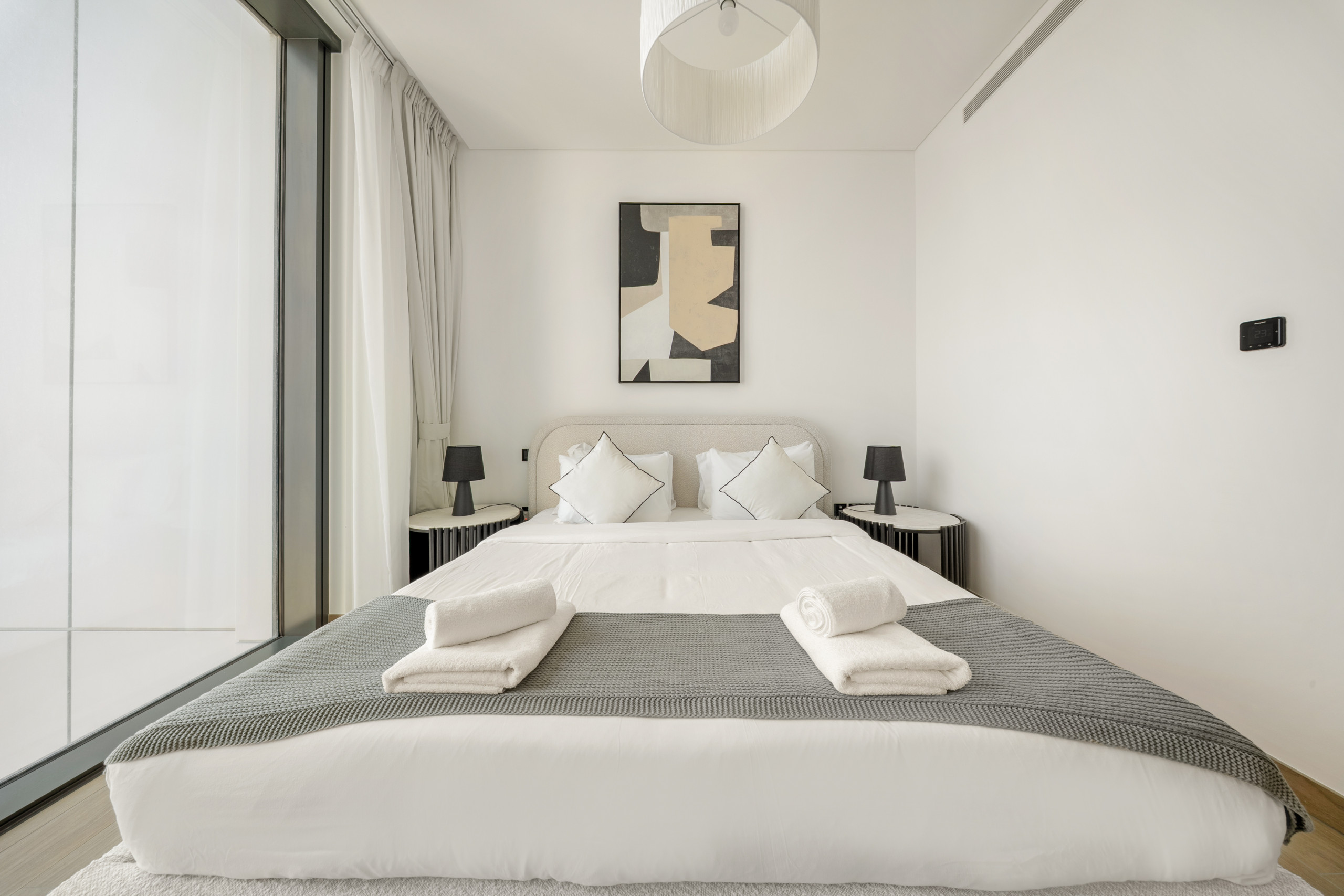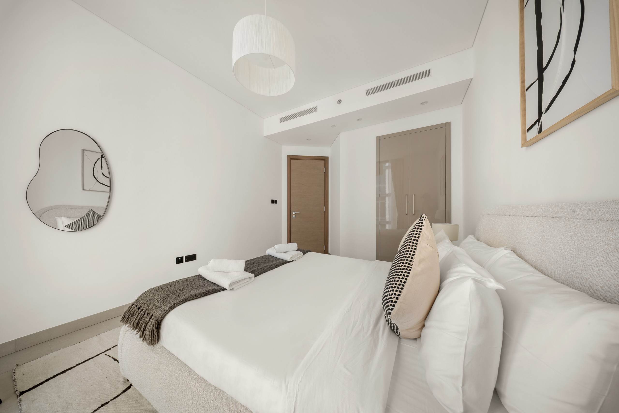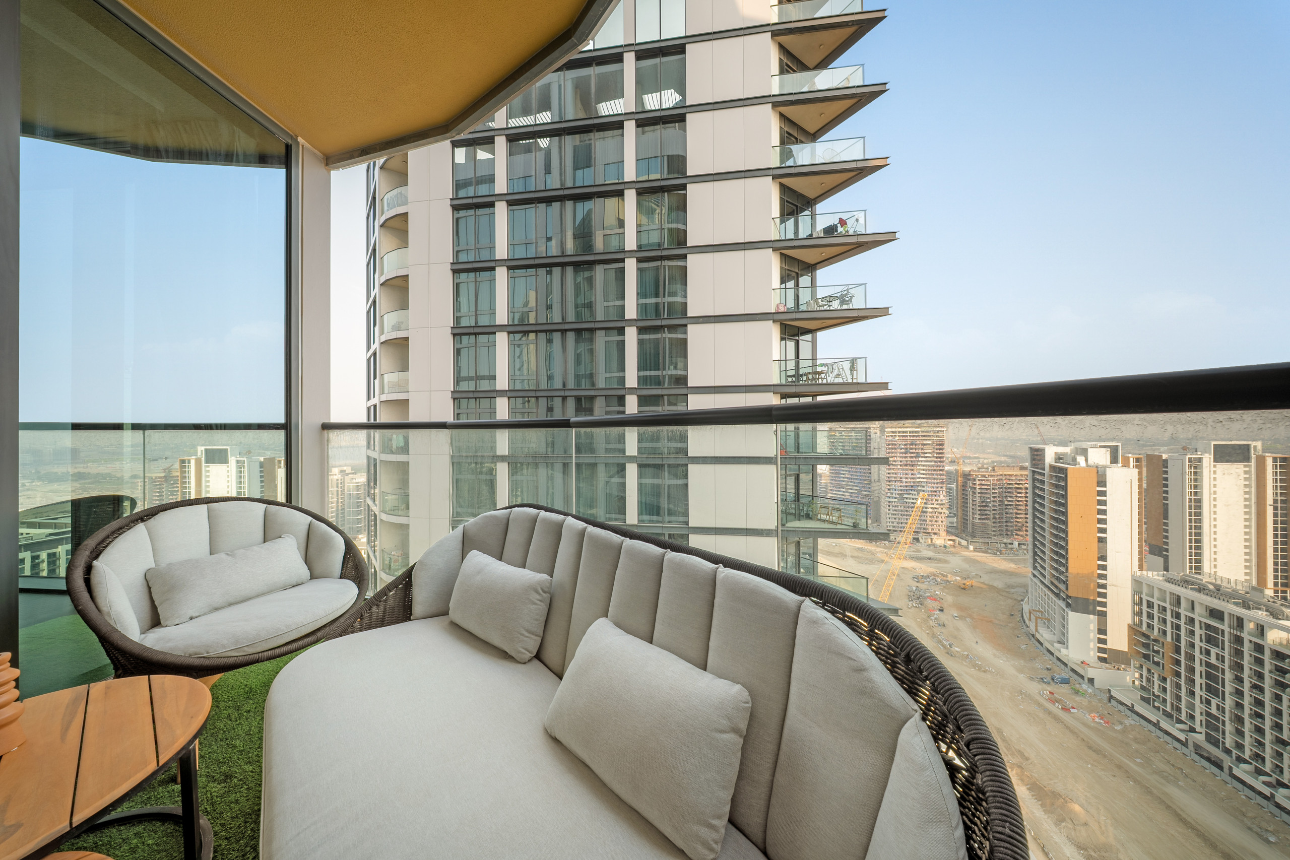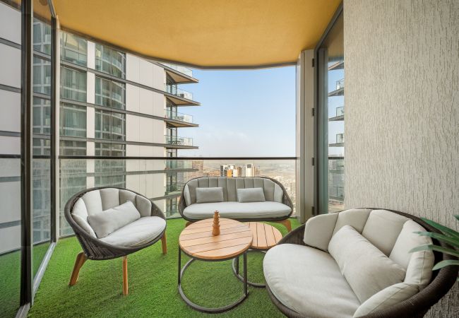 The apartment in Dubai has 2 bedrooms and has capacity for 5 people (max. 4 adults). The apartment is 1,249 ft². The accommodation is equipped with the following items: elevator, outdoor furniture, terrace, washing machine, iron, internet (Wi-Fi), hair dryer, balcony, children area, gym / fitness centre, alarm, air-conditioned, communal+children's swimming pool, garage in the same building, 1 TV.In the gas open plan kitchen, refrigerator, microwave, oven, freezer, dishes/cutlery, kitchen utensils, toaster and kettle are provided.