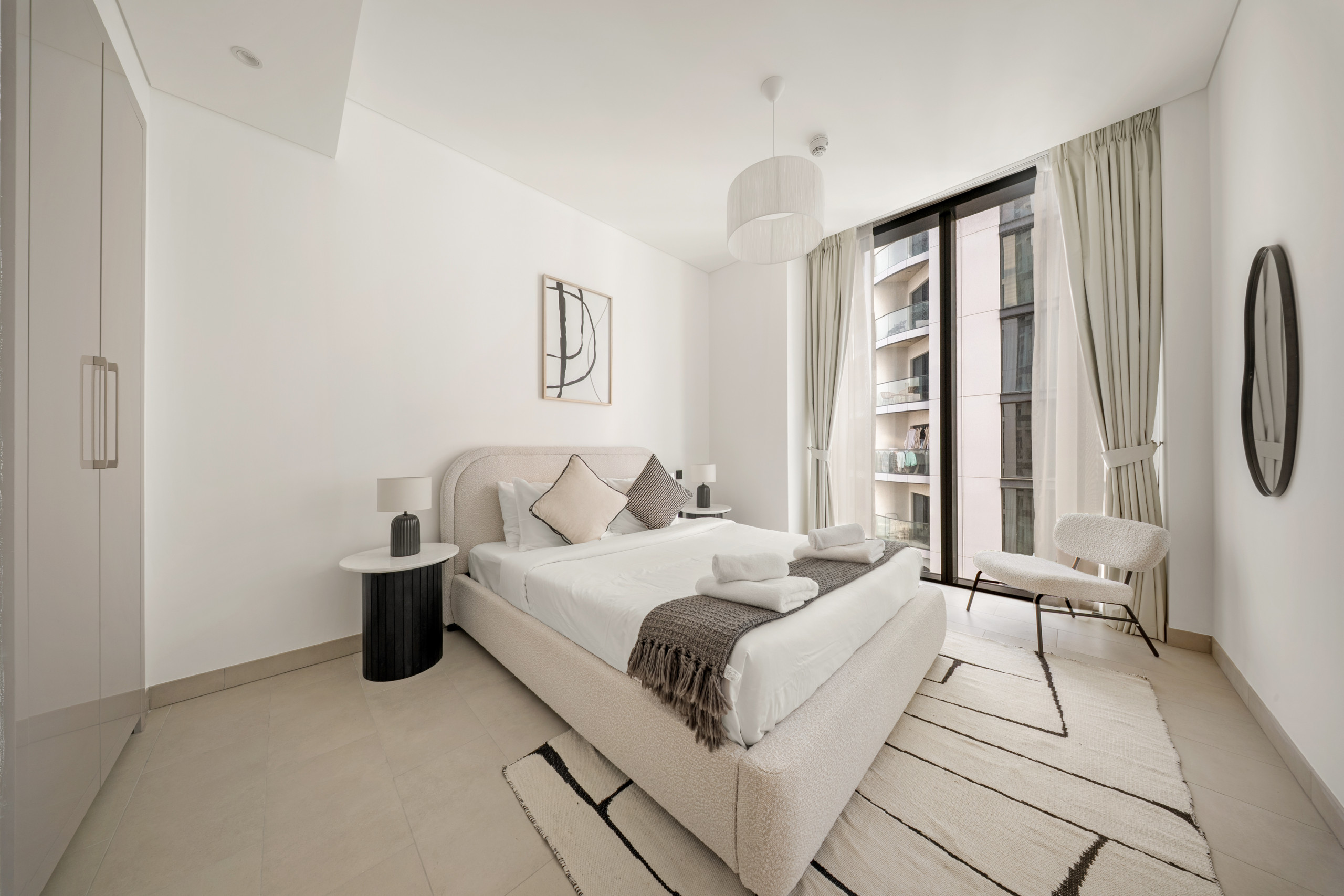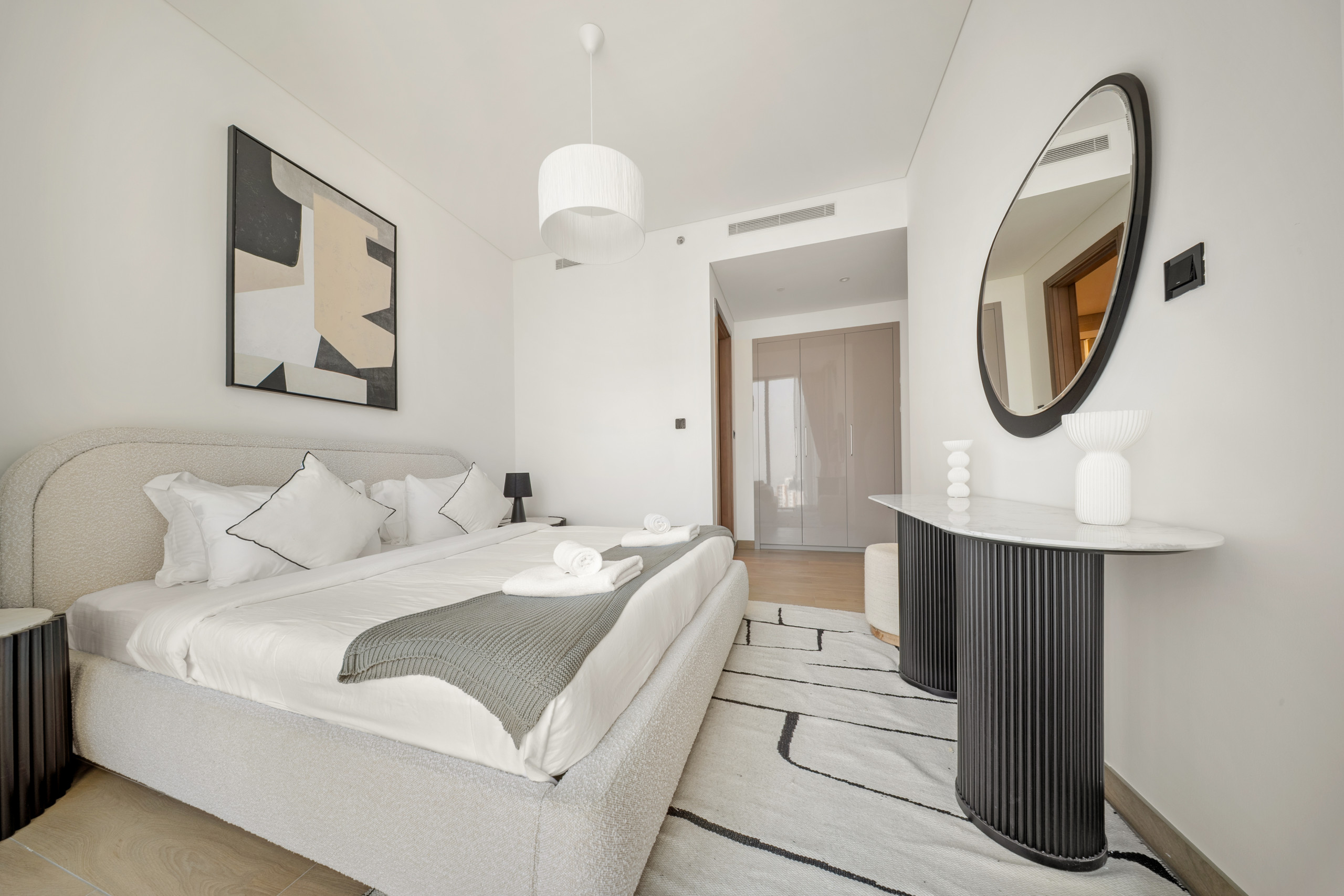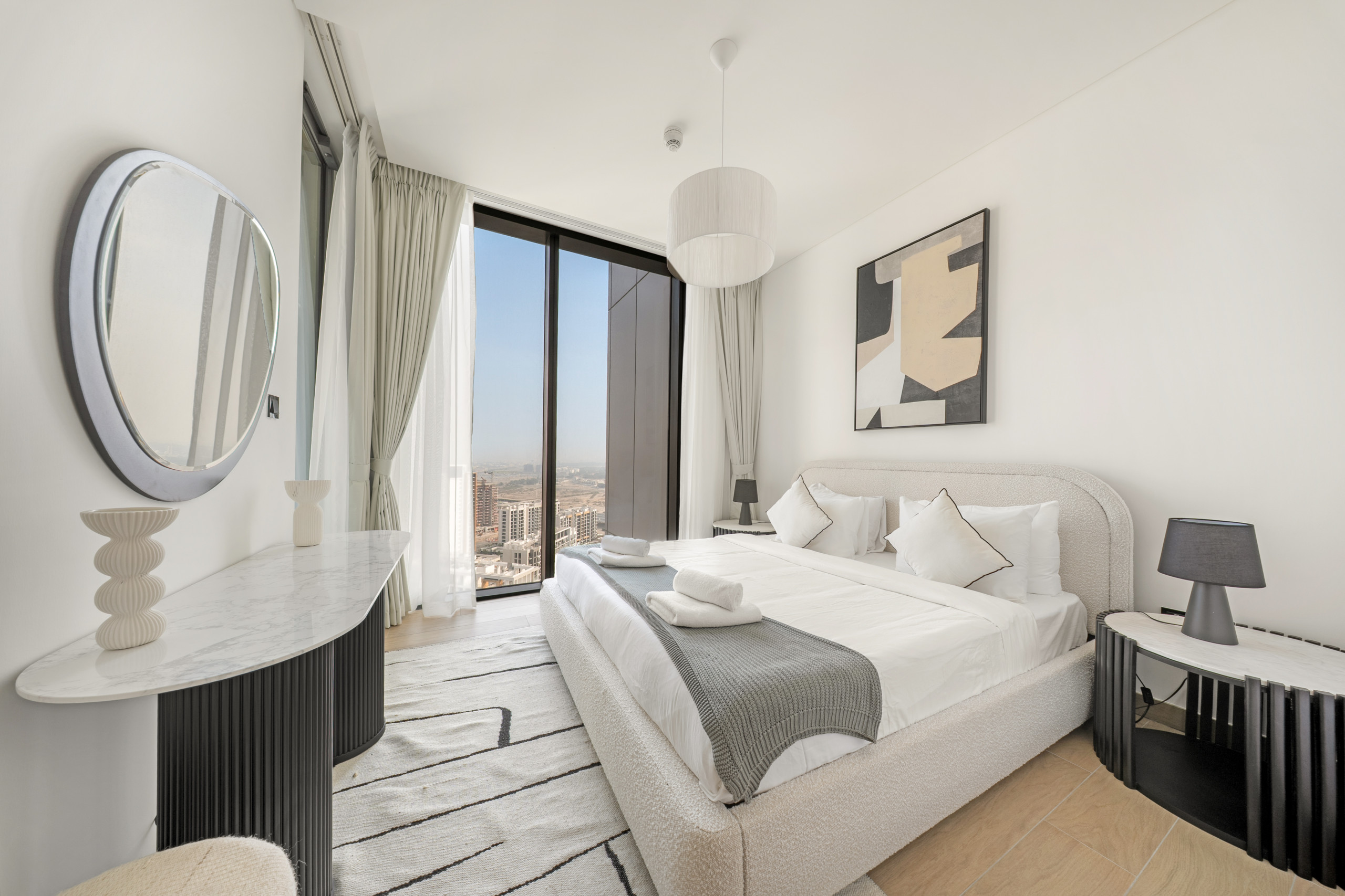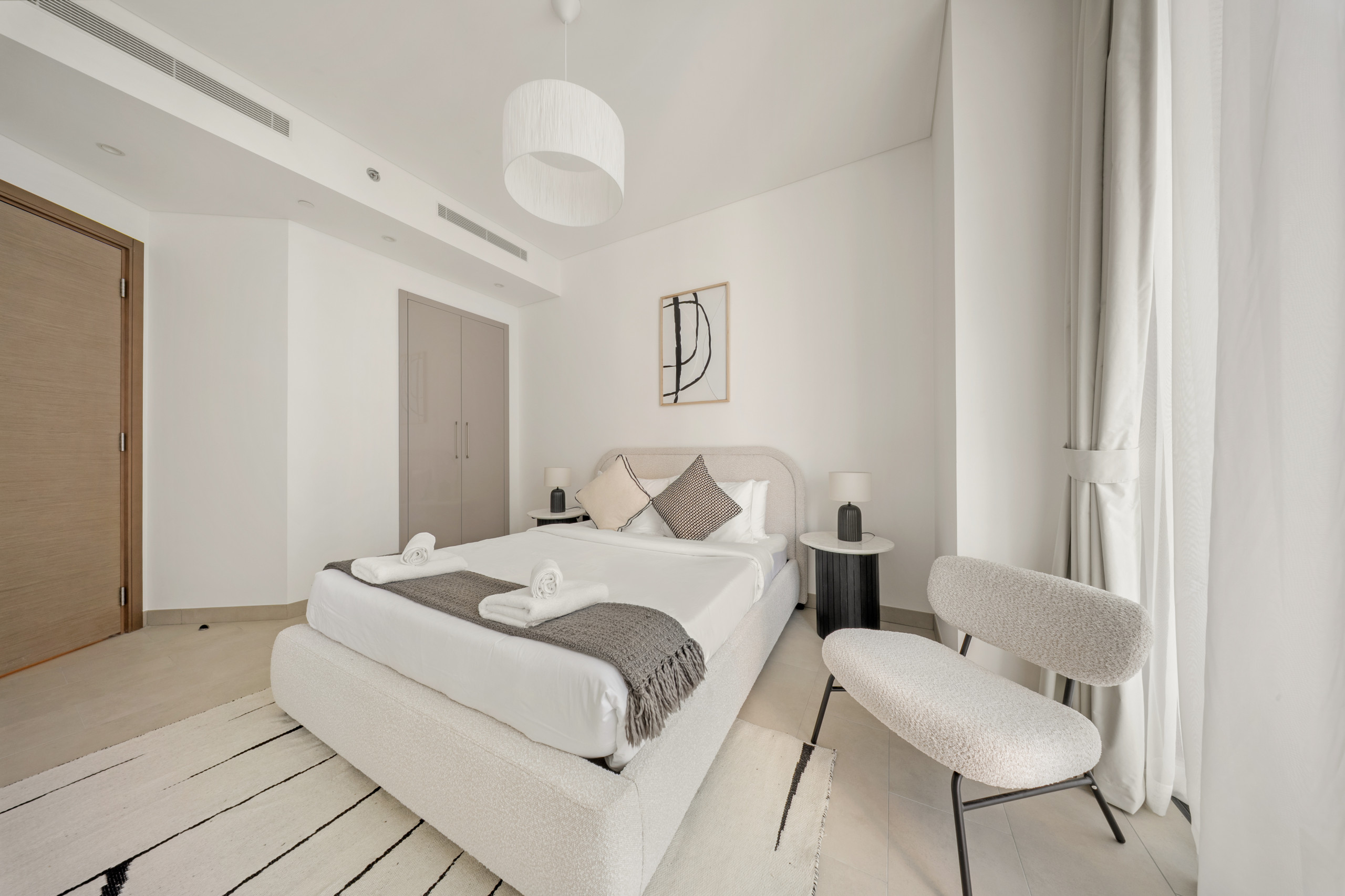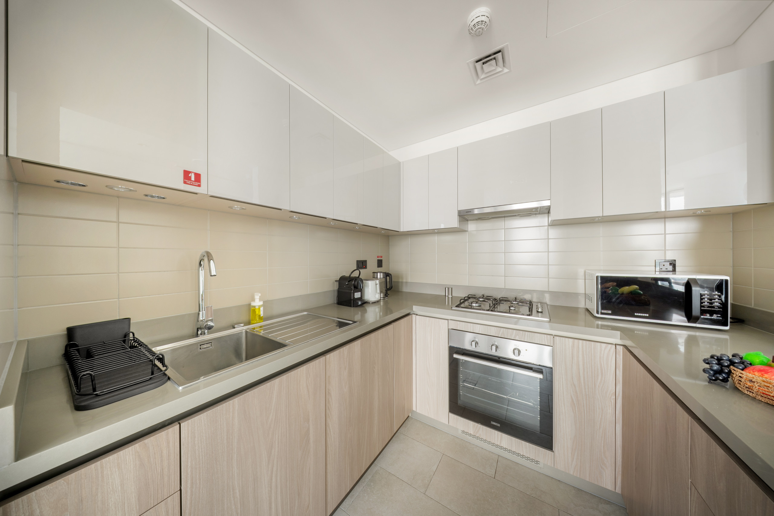 The apartment in Dubai has 2 bedrooms and has capacity for 5 people (max. 4 adults). The apartment is 1,249 ft². The accommodation is equipped with the following items: elevator, outdoor furniture, terrace, washing machine, iron, internet (Wi-Fi), hair dryer, balcony, children area, gym / fitness centre, alarm, air-conditioned, communal+children's swimming pool, garage in the same building, 1 TV.In the gas open plan kitchen, refrigerator, microwave, oven, freezer, dishes/cutlery, kitchen utensils, toaster and kettle are provided.