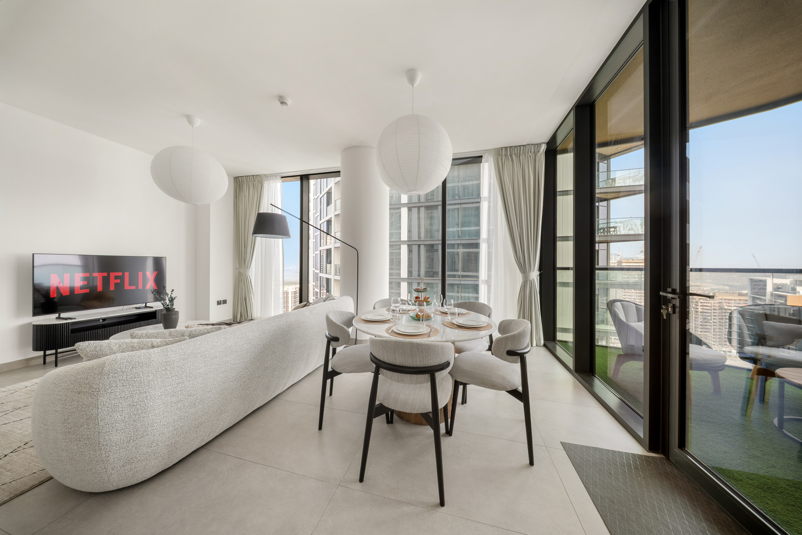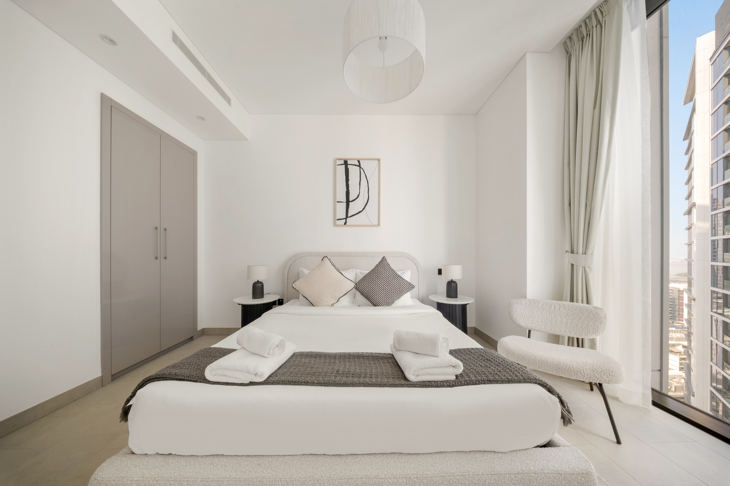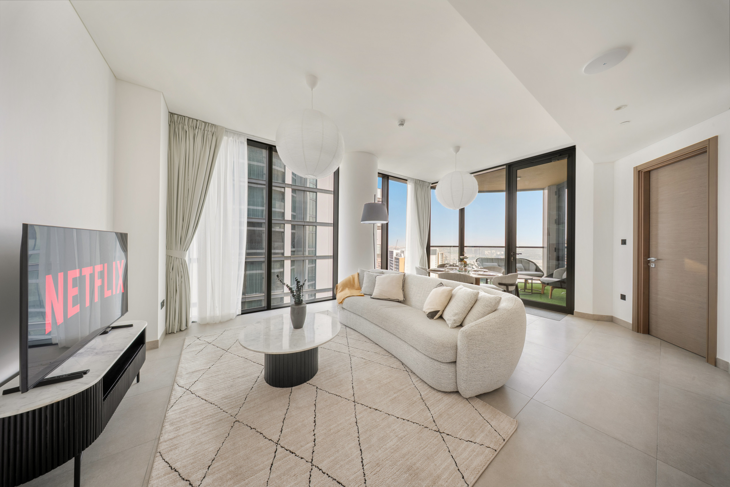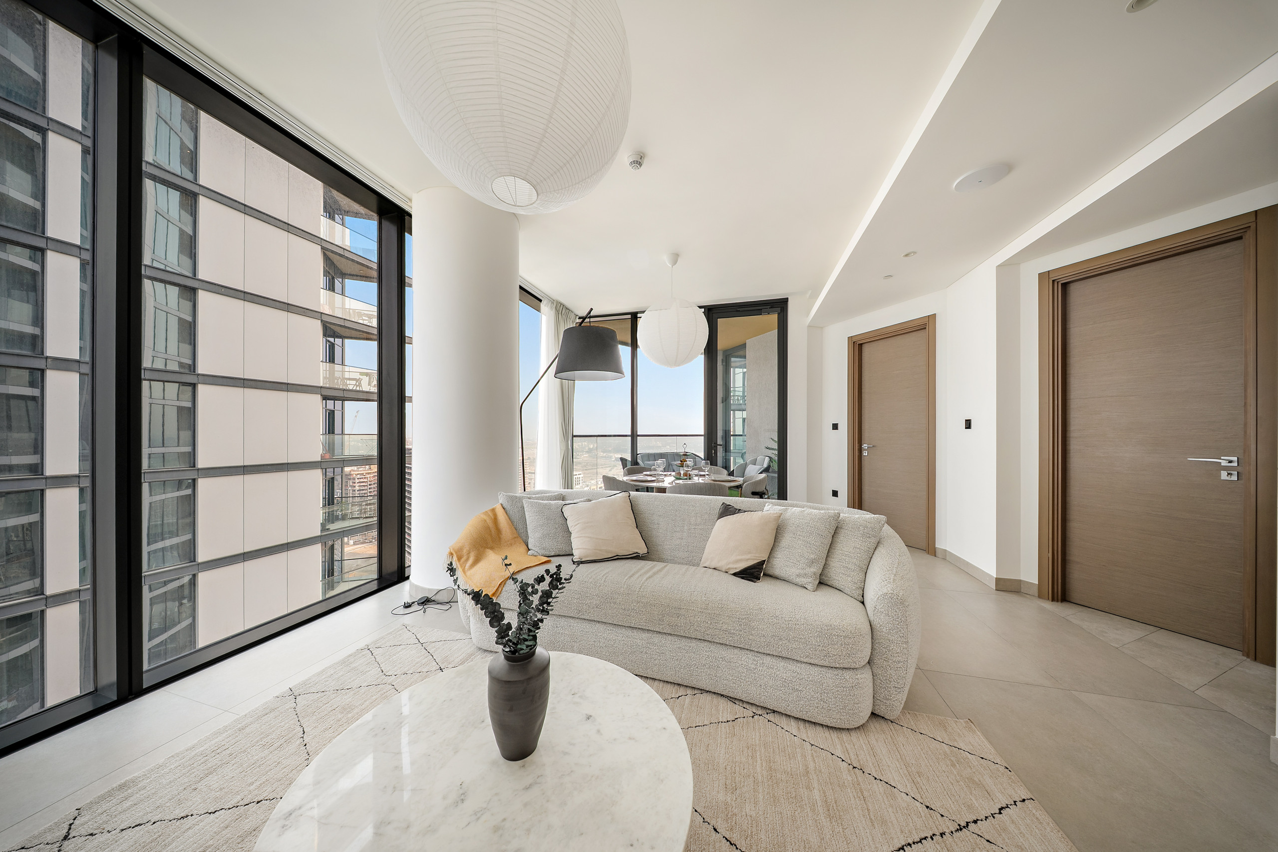 The apartment in Dubai has 2 bedrooms and has capacity for 5 people (max. 4 adults). The apartment is 1,249 ft². The accommodation is equipped with the following items: elevator, outdoor furniture, terrace, washing machine, iron, internet (Wi-Fi), hair dryer, balcony, children area, gym / fitness centre, alarm, air-conditioned, communal+children's swimming pool, garage in the same building, 1 TV.In the gas open plan kitchen, refrigerator, microwave, oven, freezer, dishes/cutlery, kitchen utensils, toaster and kettle are provided.