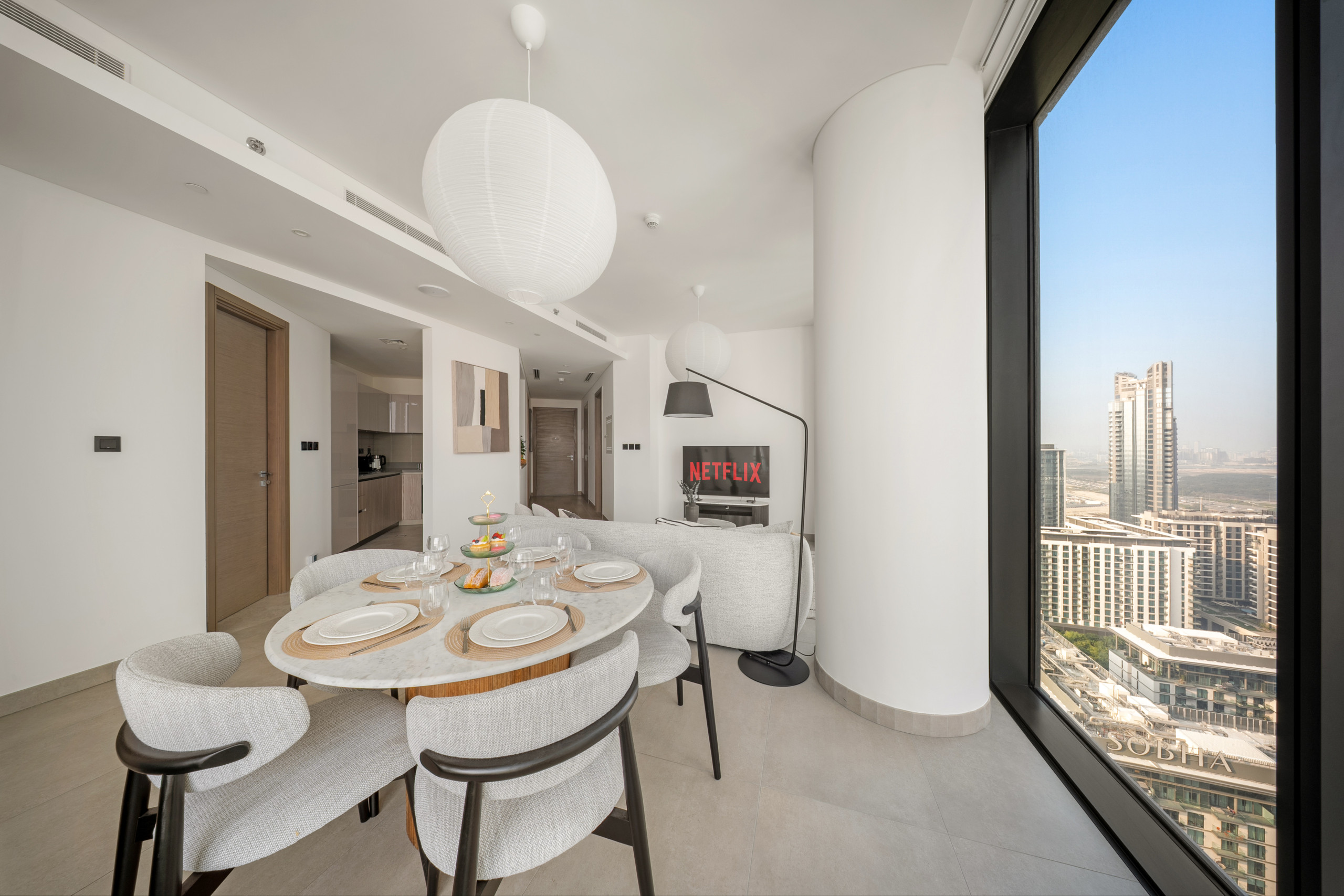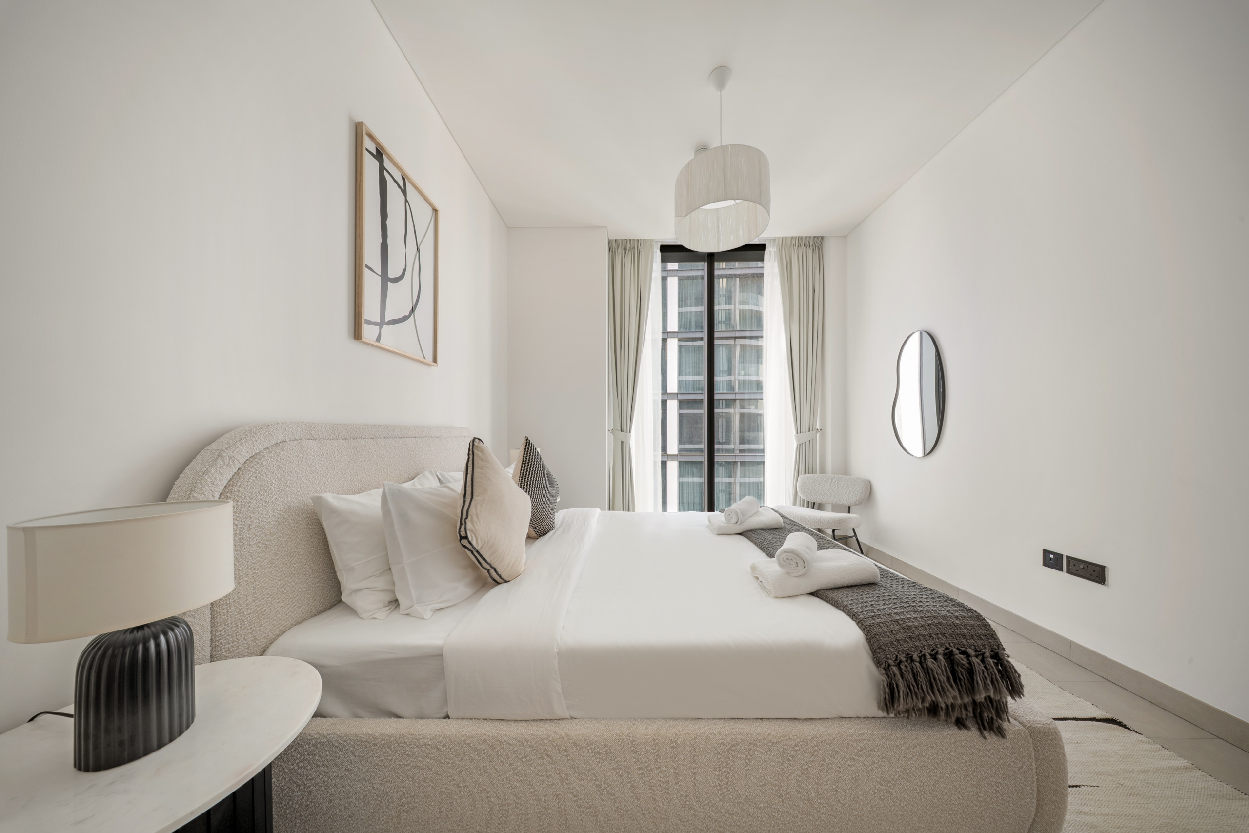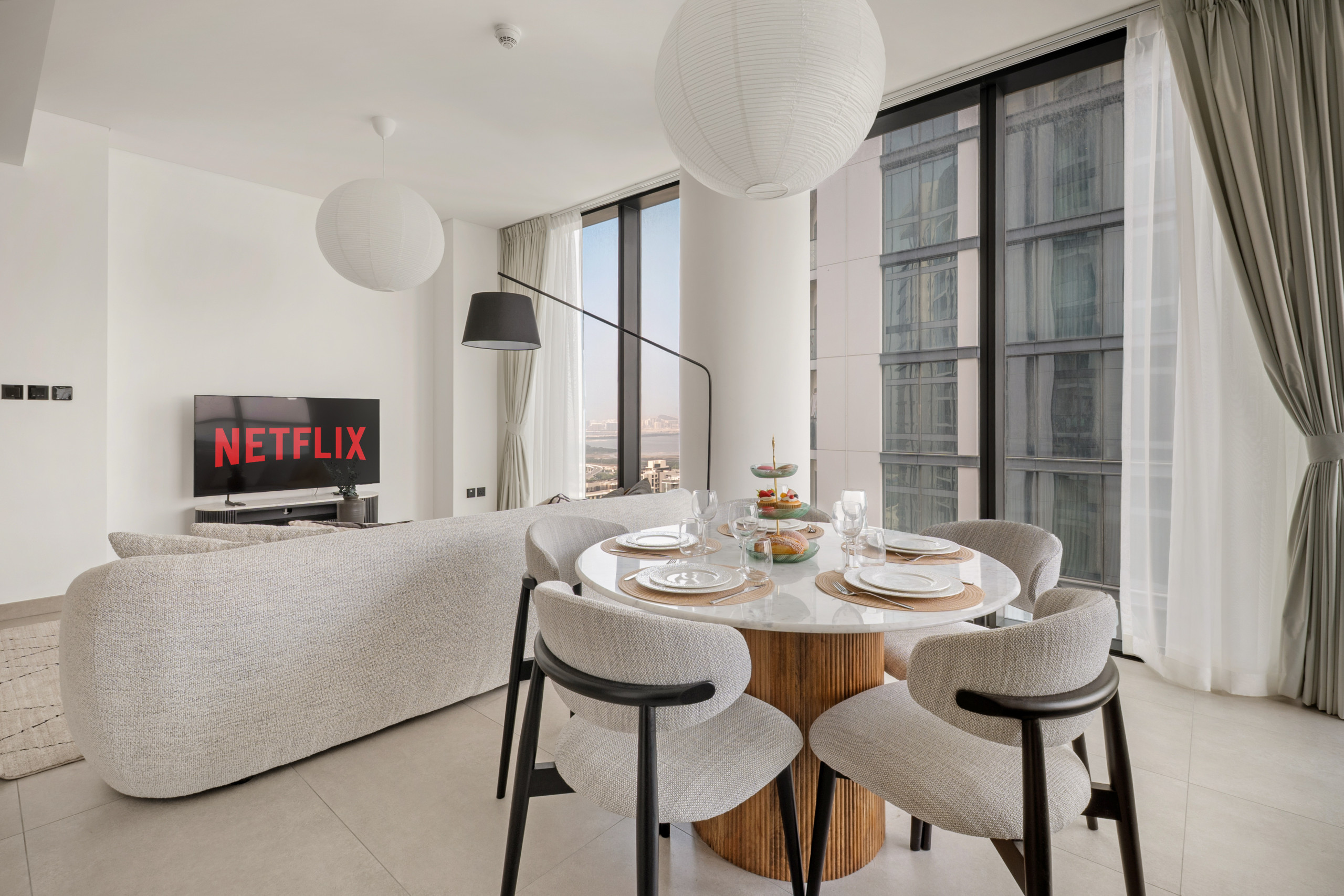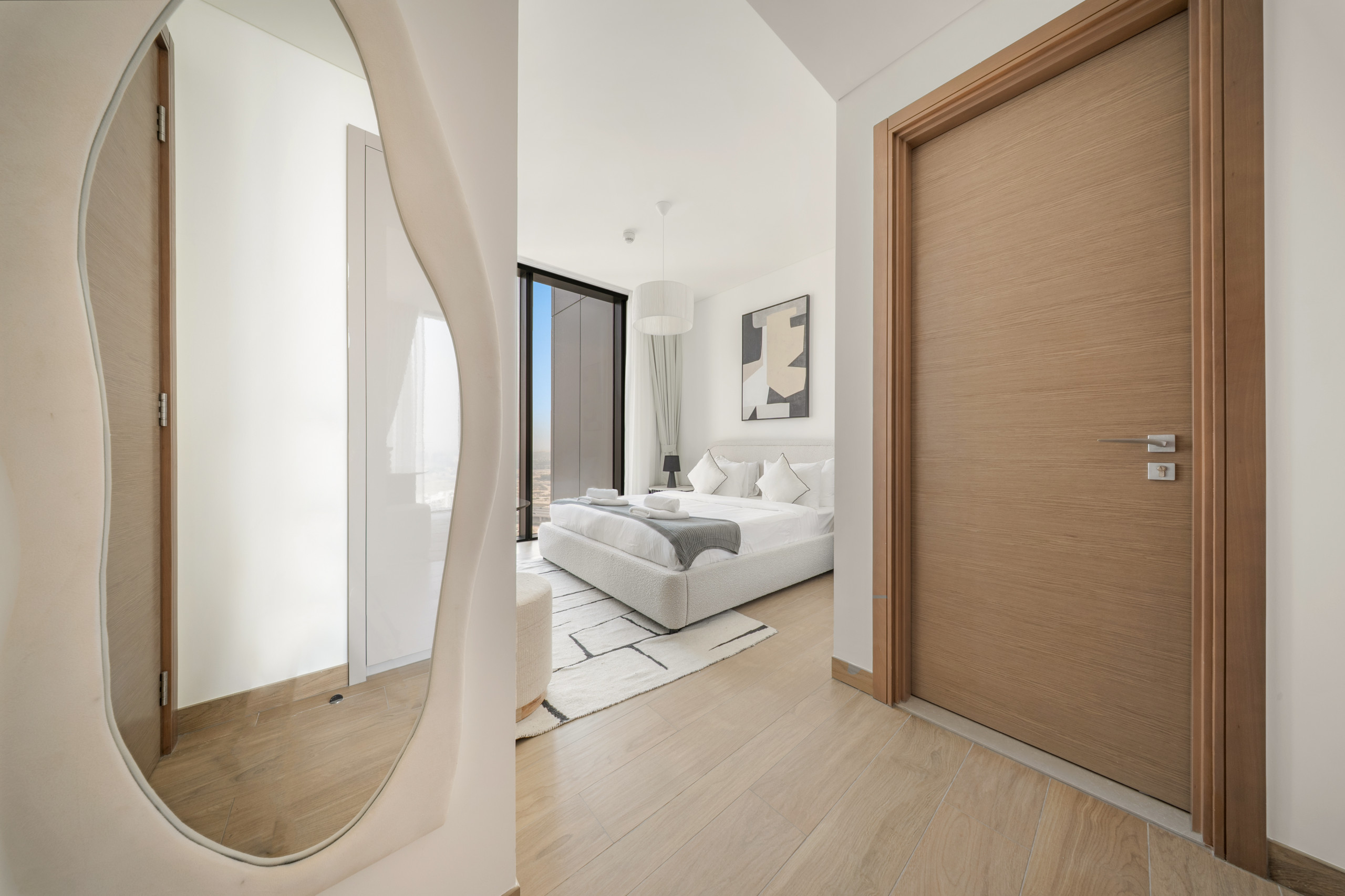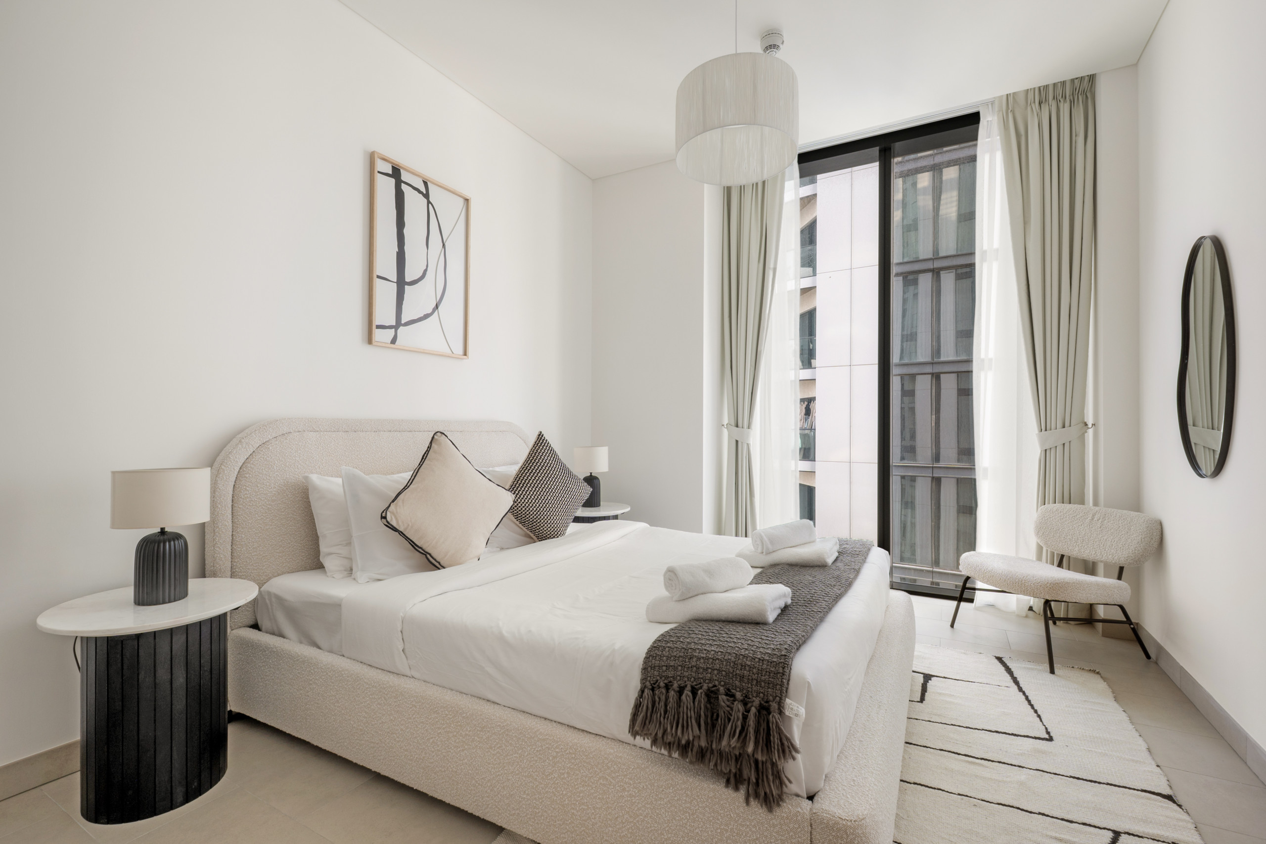 The apartment in Dubai has 2 bedrooms and has capacity for 5 people (max. 4 adults). The apartment is 1,249 ft². The accommodation is equipped with the following items: elevator, outdoor furniture, terrace, washing machine, iron, internet (Wi-Fi), hair dryer, balcony, children area, gym / fitness centre, alarm, air-conditioned, communal+children's swimming pool, garage in the same building, 1 TV.In the gas open plan kitchen, refrigerator, microwave, oven, freezer, dishes/cutlery, kitchen utensils, toaster and kettle are provided.